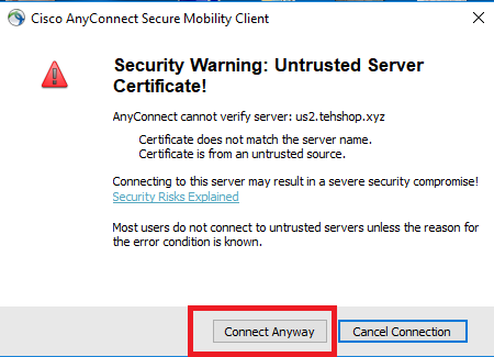 در صورت پیغام طبق تصویر زیر گزینه connect anyway را بزنید